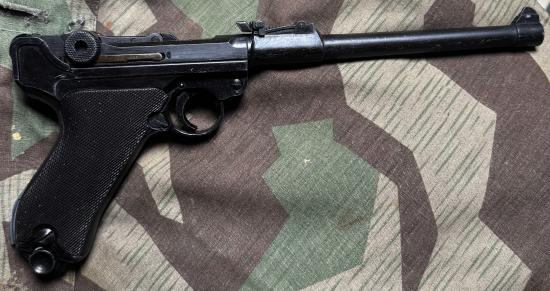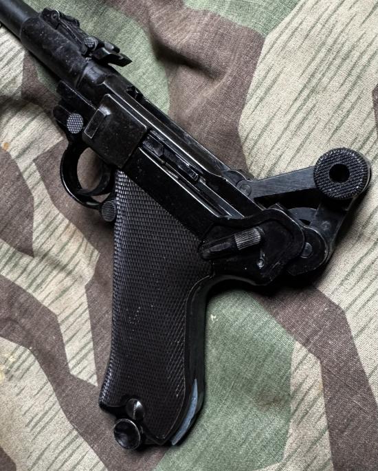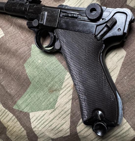 Good used condition metal replica of the famous artillery Luger pistol. Presumably of Japanese manufacture, it cocks and strips as an original but does not seem to dry fire.