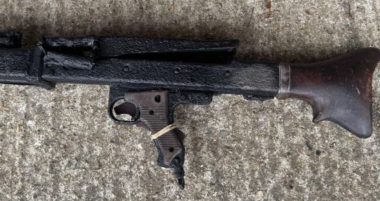 Relic MG42, has been painted to stabilise corrosion. Repro hand grip plates and cast resin buttstock