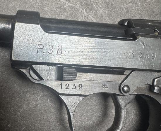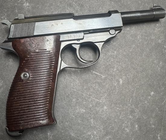 Excellent used condition deactivated 1945 dated Walther produced P38. Matching serial numbers. Complete with certificate