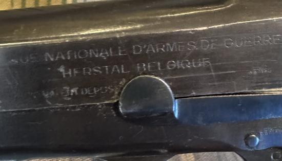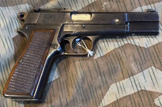 Good used condition early Browning Hi Power 9mm pistol with tangent sights. Matching serial numbers and WaA eagle proofs. Complete with certificate