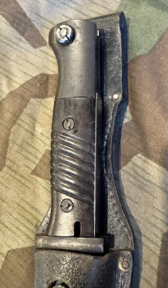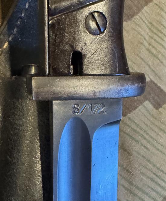 Exceptional condition blade K98 bayonet with matching numbers. WaA marked, maker marked and dated. Complete with original frog