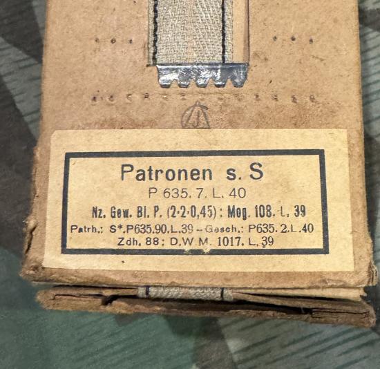 Complete cardboard ammunition carton filled with inert rounds contained within the original cardboard carton in excellent original condition. All inert rounds contained within are original German wartime 7.92mm