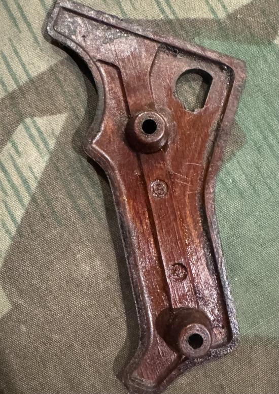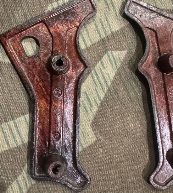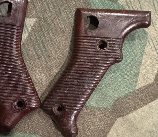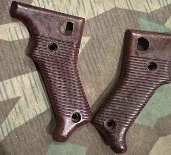 Rare to find matched set of original brown Bakelite grips for the MG42. Maker marked