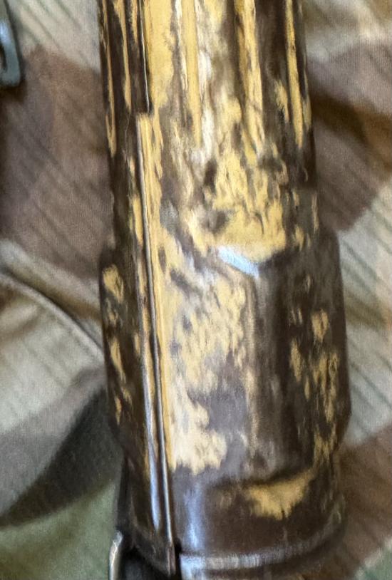 Original dunkelgelb tan yellow paint barrel carrier for the MG42 with lux marked strap. Rare model barrel carrier.