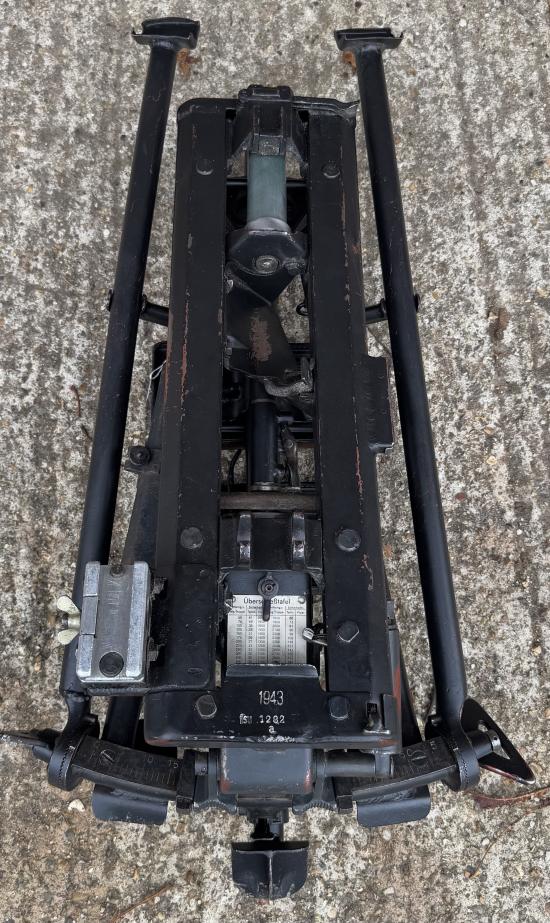 Excellent working condition MG42 lafette tripod dated 1943 and coded fsu. Waffenampt stamped with range plate, bolt box, sight mounting block and leather back pads in German dark field grey.