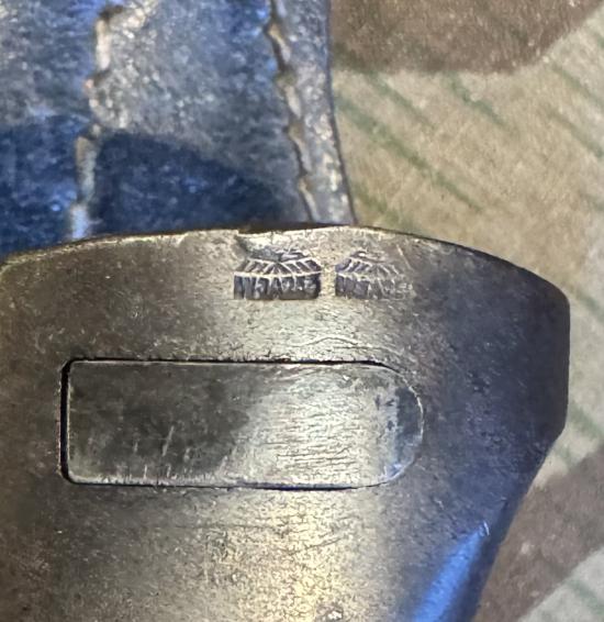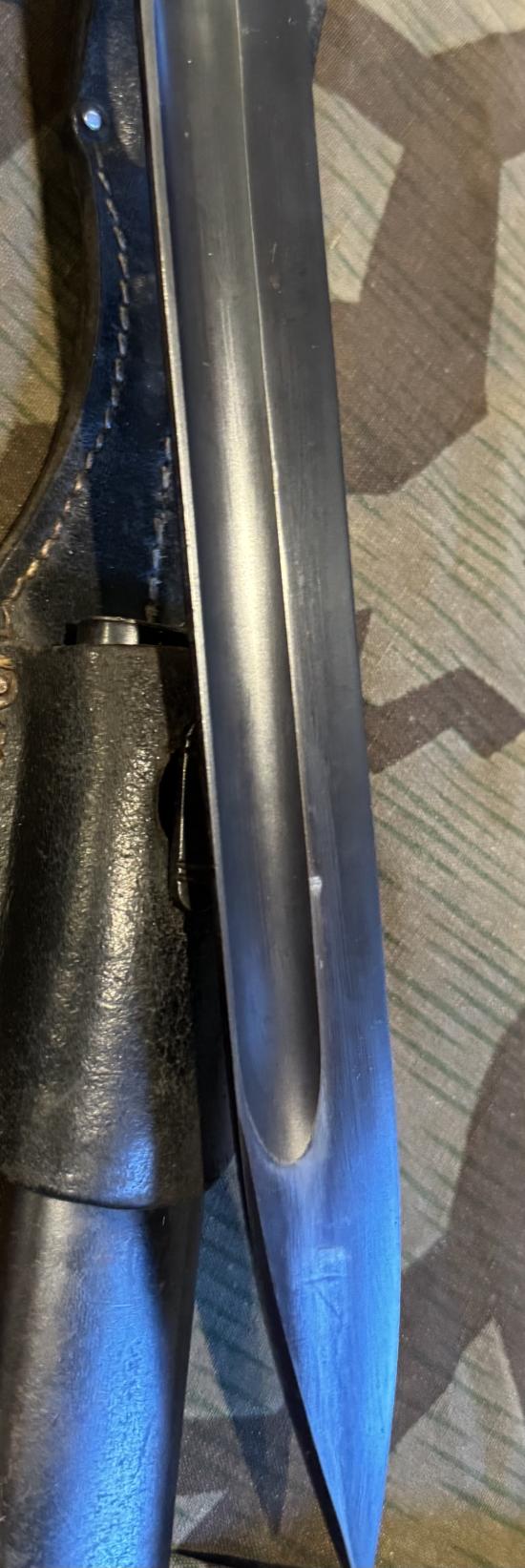 Exceptional condition blade K98 bayonet with matching numbers. WaA marked, maker marked and dated. Complete with original frog