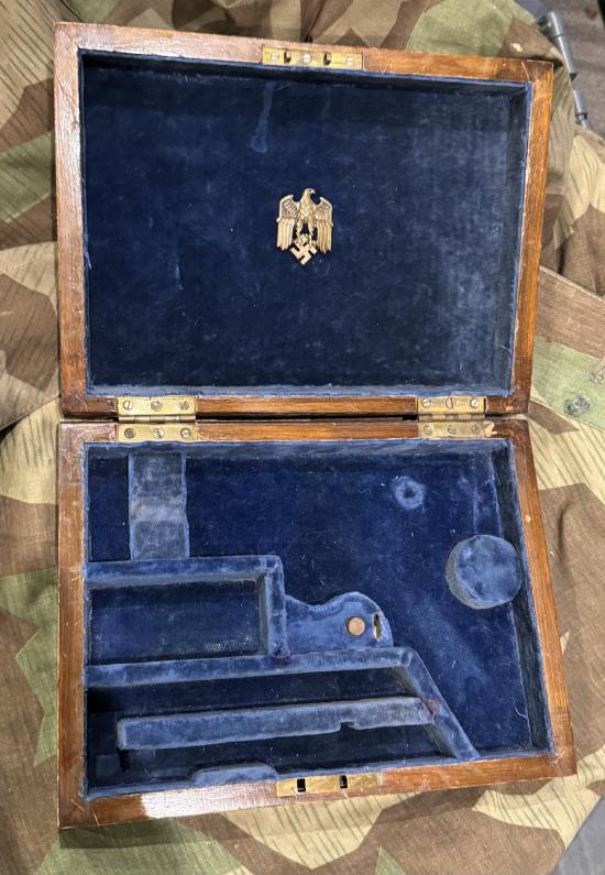 A very nice velvet lined presentation, display and storage box. Compartmentalised for a Luger, 2x spare magazines, loading/stripping tool and 16 round cartridge carton. There is also some German third reich insignia inside the lid. This box has age to it and is not new made.