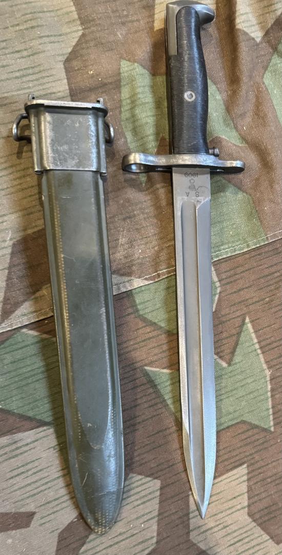 1909 AND 'SA' MARKED FOR SPRINGFIELD ARSENAL, OFFICALLY CONVERTED FROM THE 16INCH BLADE TO 10 INCH BLADE FOR THE GARAND RIFLE CUT TO SCARCE TANTO CUT SPEARPOINT' WITH FULLER GOING TO TIP ,RICASSO ALSO MARKED UFH® FOR UNION FORK AND HOE COMPANY THIS WAS THE COMPANY WHO CONVERTED THE BLADE US FLAMING BOMB TO SCABBARD THROAT