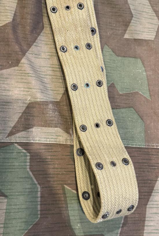 A genuine World War 2 U.S. Army issued M1936 Pistol Belt. This tan M1936 belt was used to attach pouches like the M1923 & M1 Carbine, it has three eyelet rows, lower for double hook equipment, middle was for waist size and the top row for suspender snaps, 'U.S.' ink markings to front, makers marks to inside and made by R.M.C.O dated 1943, measures: 41" Long.