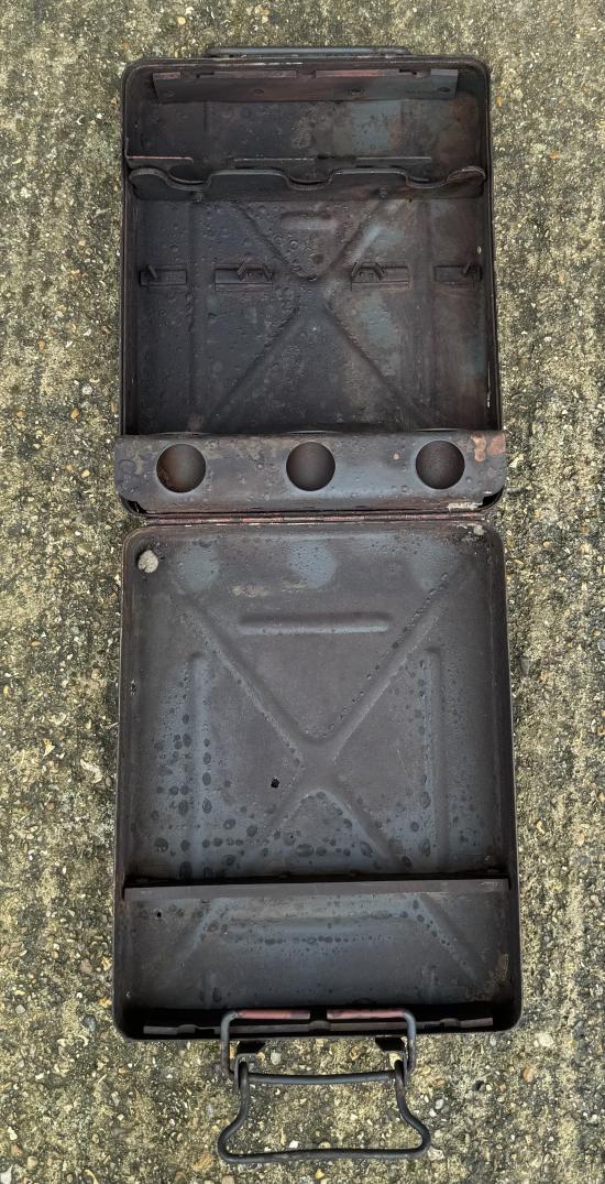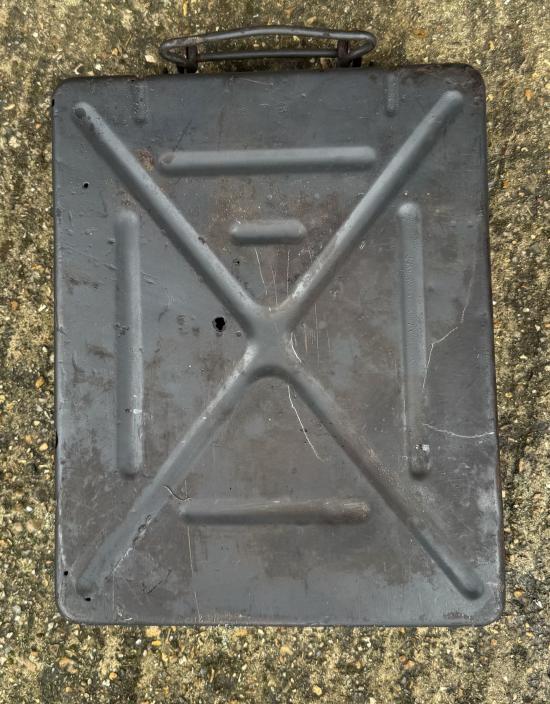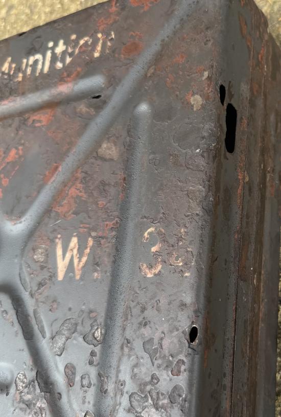 WW2 German 8cm Mortar Round Box In grey. Good used condition, some holes. Nice markings and stamp