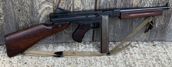 Excellent condition WWII US Guide Lamp produced M3 Grease gun. This is the earlier model with the cocking lever as opposed to the later simpler model which only had a hole in the bolt for cocking. The M3 was designed as a cheaper alternative to the Thompson SMG which was far more expensive as it was made from machines parts as opposed to the stamping technology which was used on the M3. Complet... read more